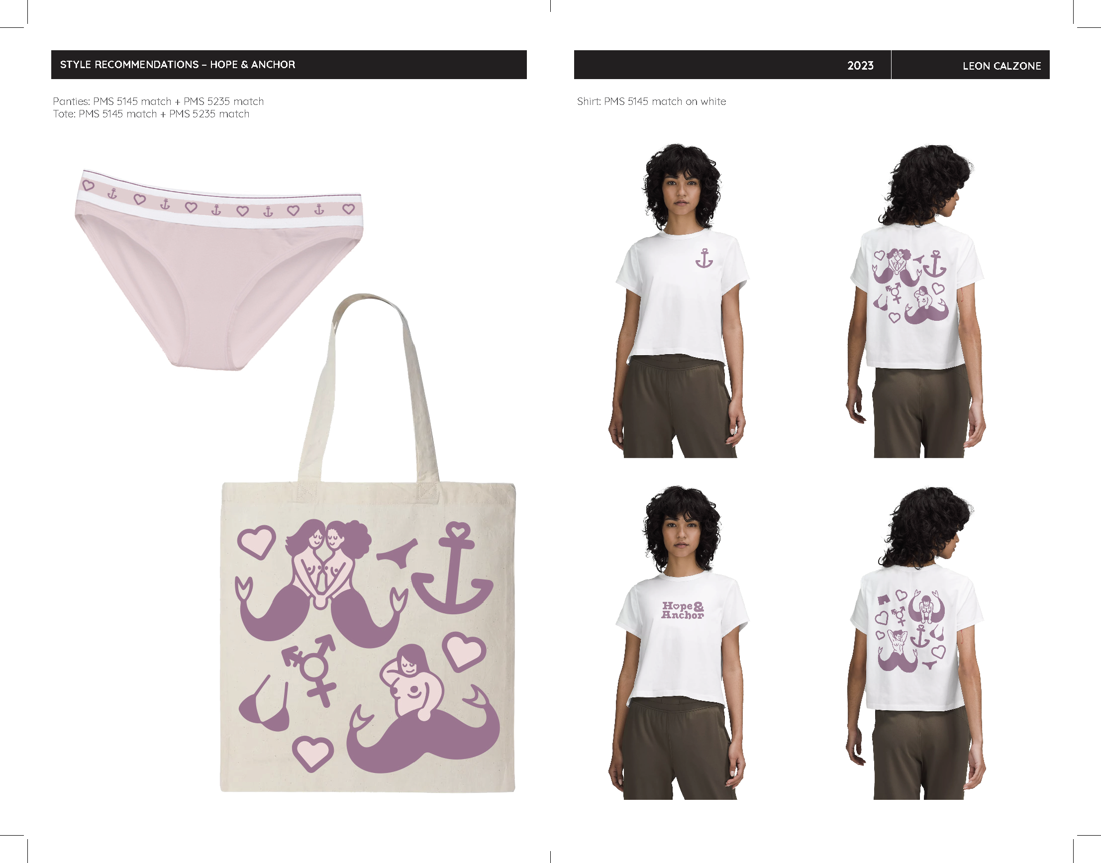 With my colors, I imagined a queer lingerie brand. I began by designing icons of two-tailed sirens, hearts, intimates, and more to create a visual identity that was playful, pretty, and related to the brand’s products and clientele. The style guide features marks, color palettes, patterns, typography, usage rules, sample products, sample stationery, and social media page mock-ups.
