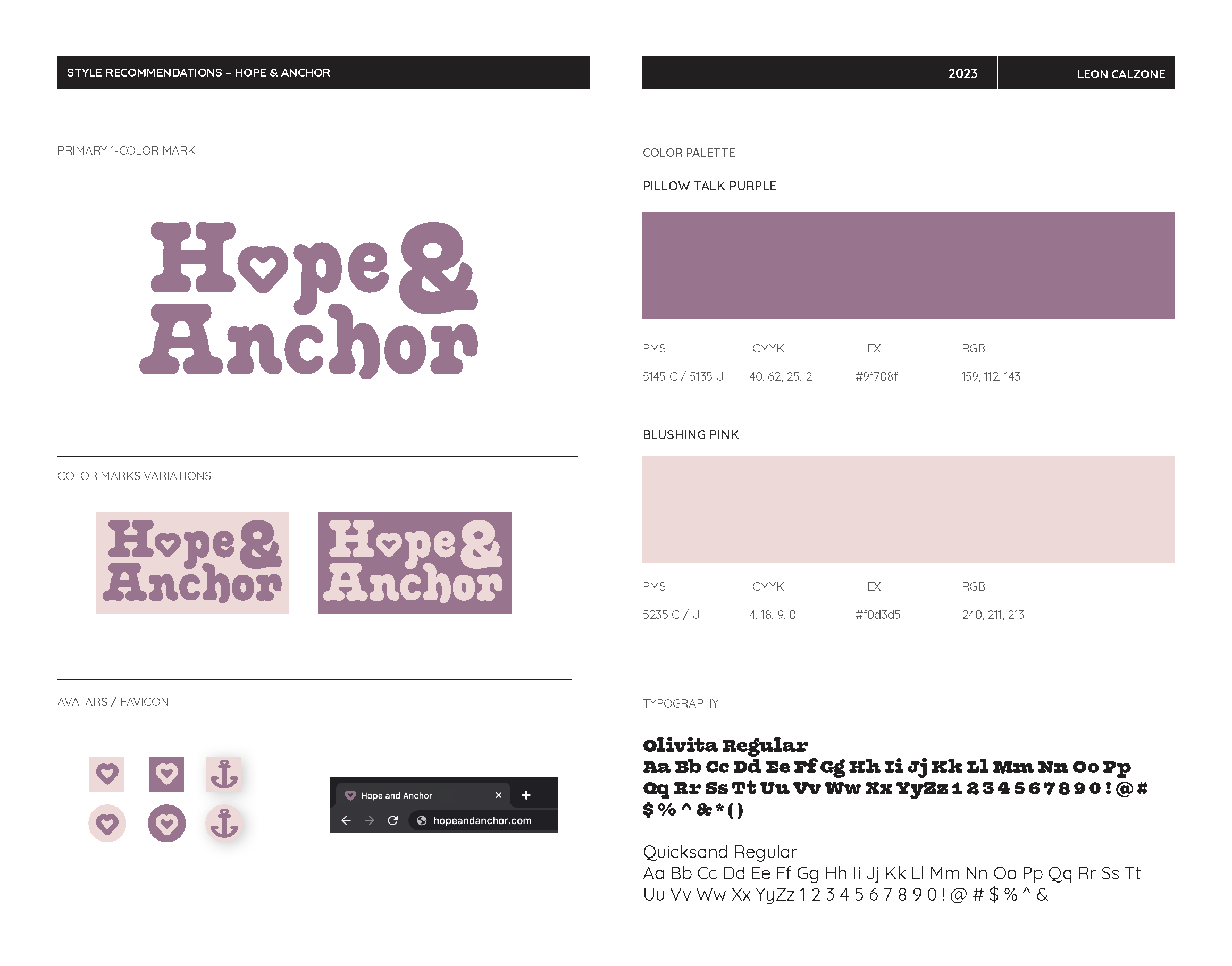 For this project, we were given the brand name ‘Hope and Anchor,’ a primary color, and our choice of secondary color to create a brand identity with.