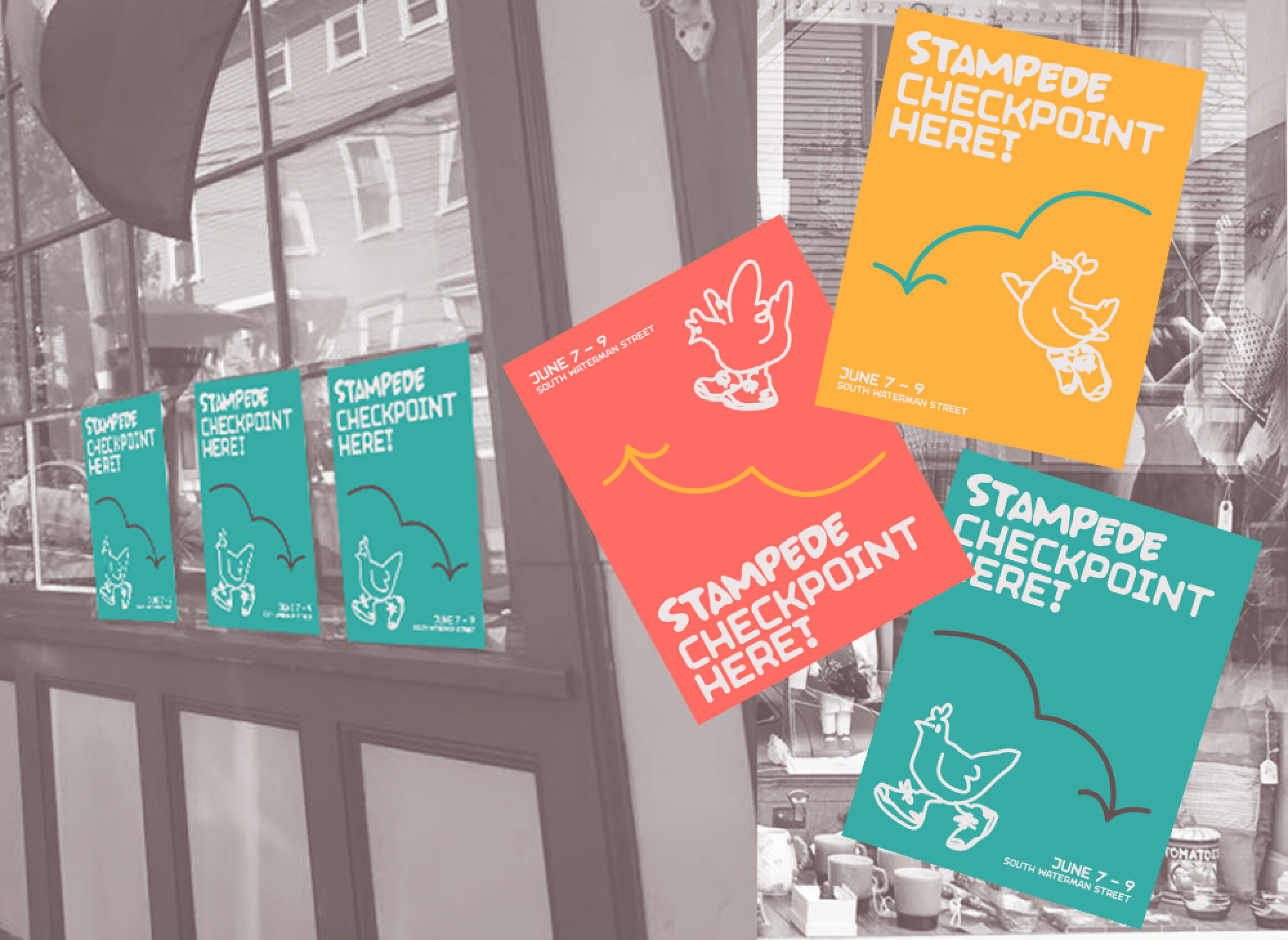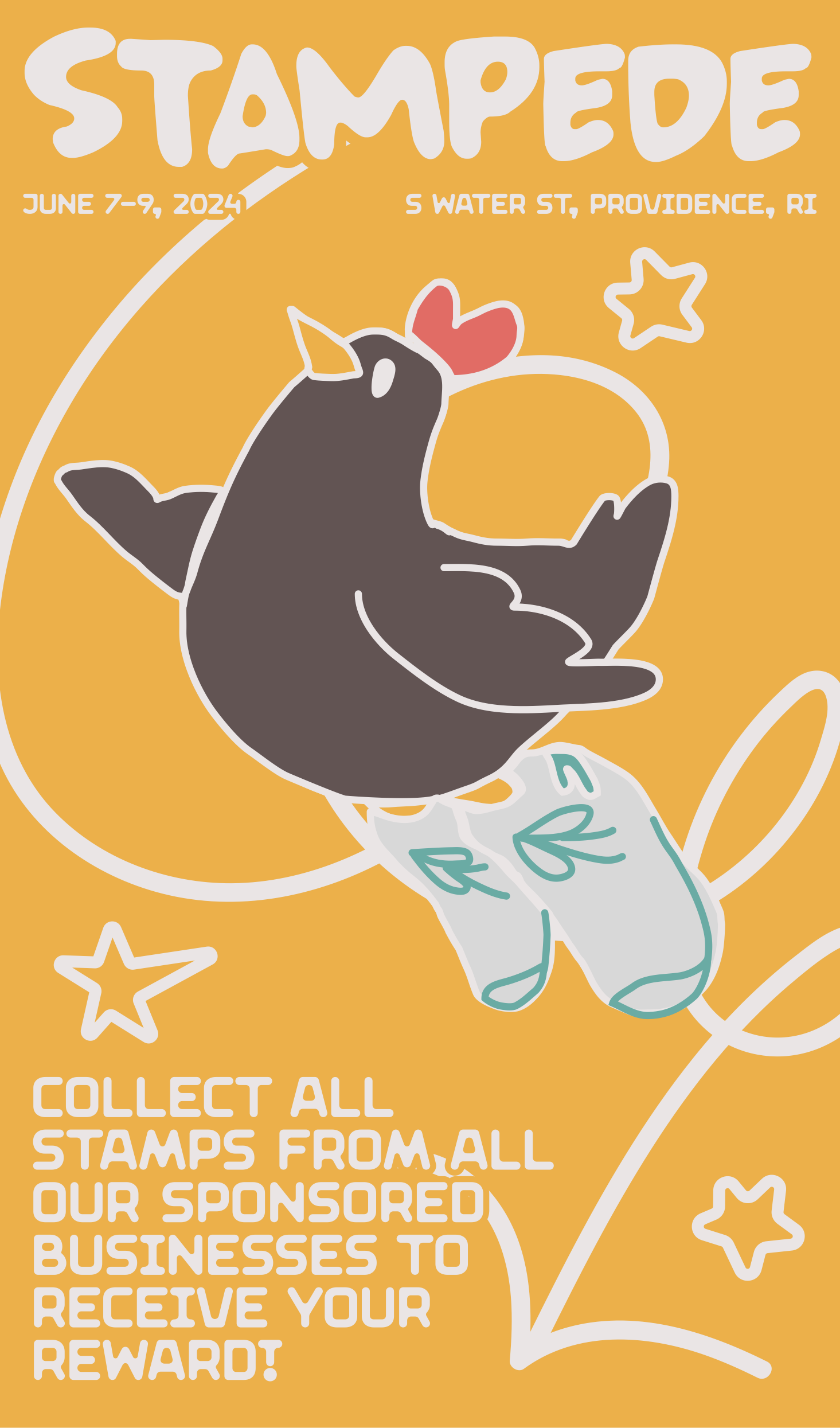 In this event, pedestrians would walk to participating local businesses to collect stamps on their Stampede stamp cards. Collecting all the stamps would earn participants rewards offered by each business to encourage people to visit again. The mascot is inspired by the Rhode Island state bird, the Rhode Island red chicken. Made as a group project with Chanya Vitayakul and Ash Ma.