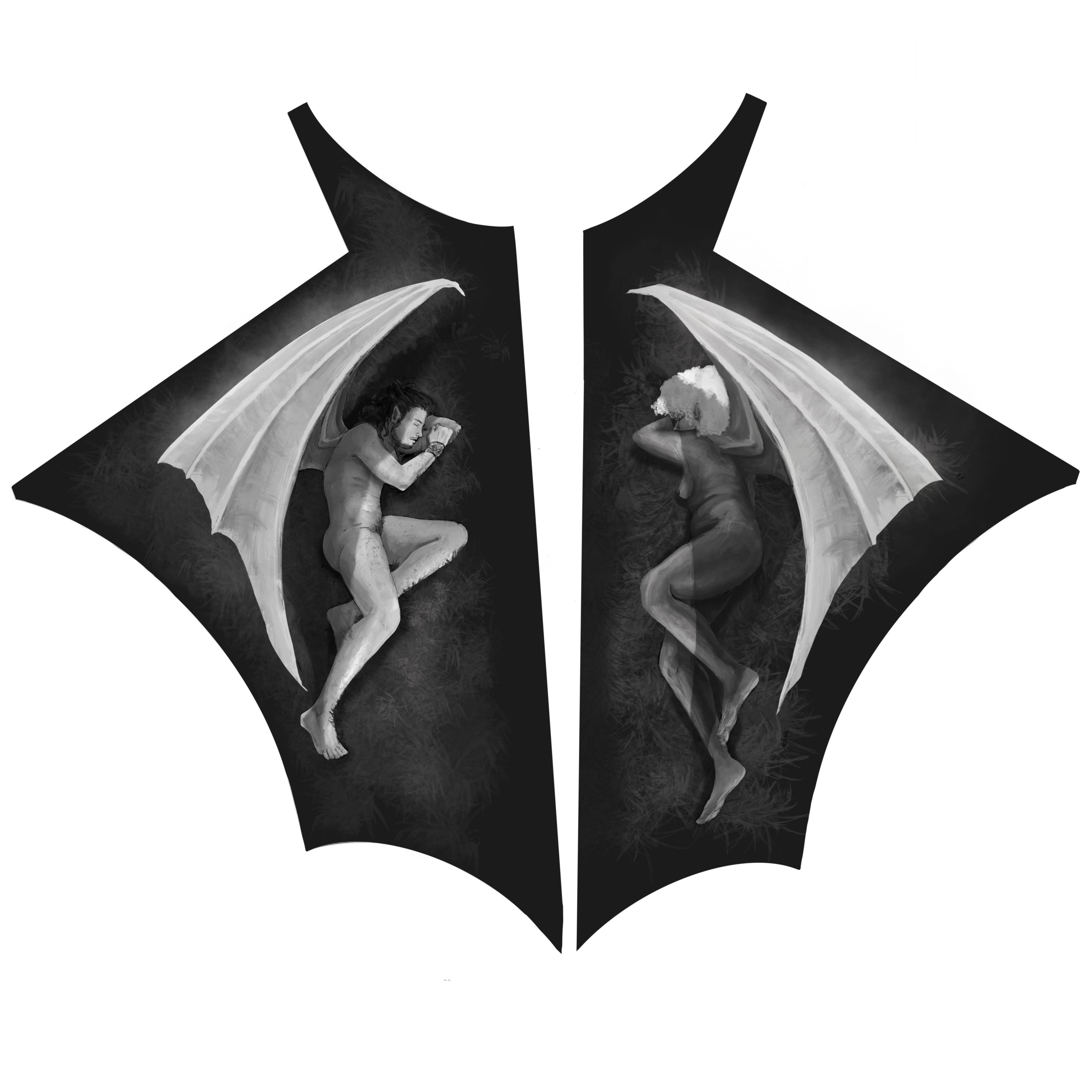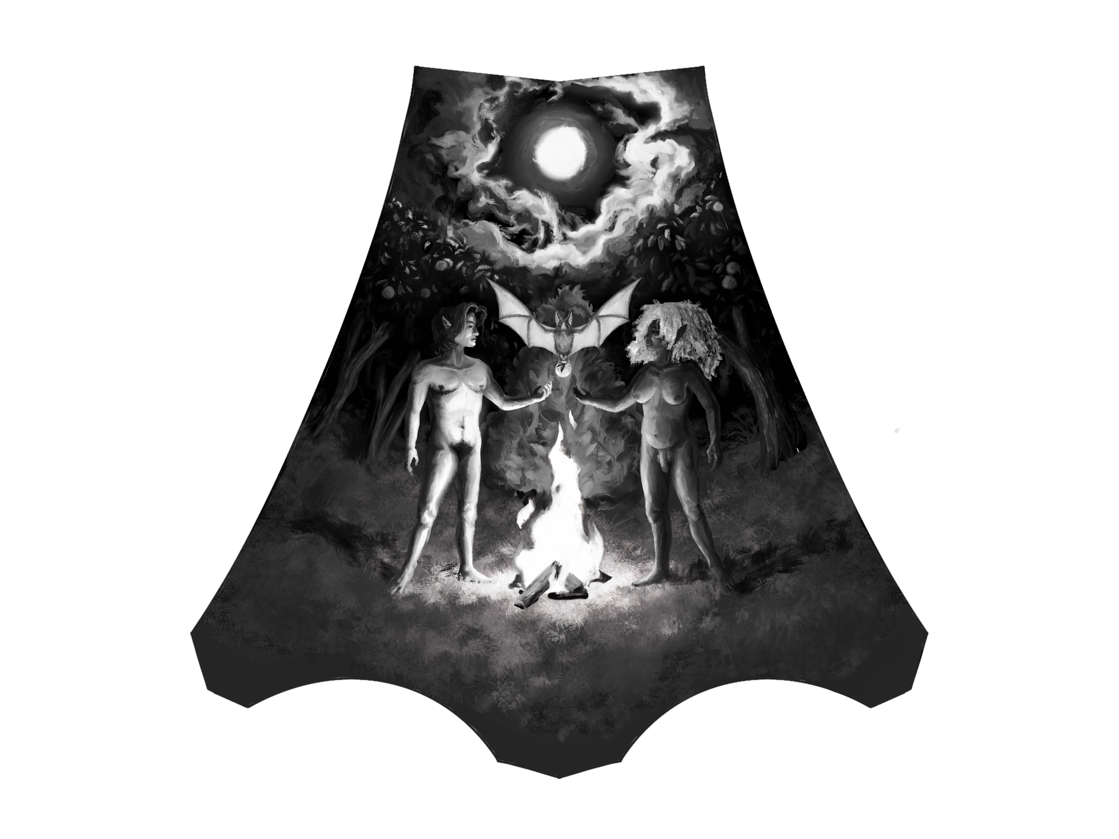 The central panel illustrates a queer vampiric creation story where two trans individuals share fruit gifted to them from a bat. The two panels beside it show a human skull and a bat skull, opened with light radiating from inside them. The back panels depict the individuals from the front, now transformed with large bat wings, lying peacefully in the grass using their wings to shield themselves from the sun.