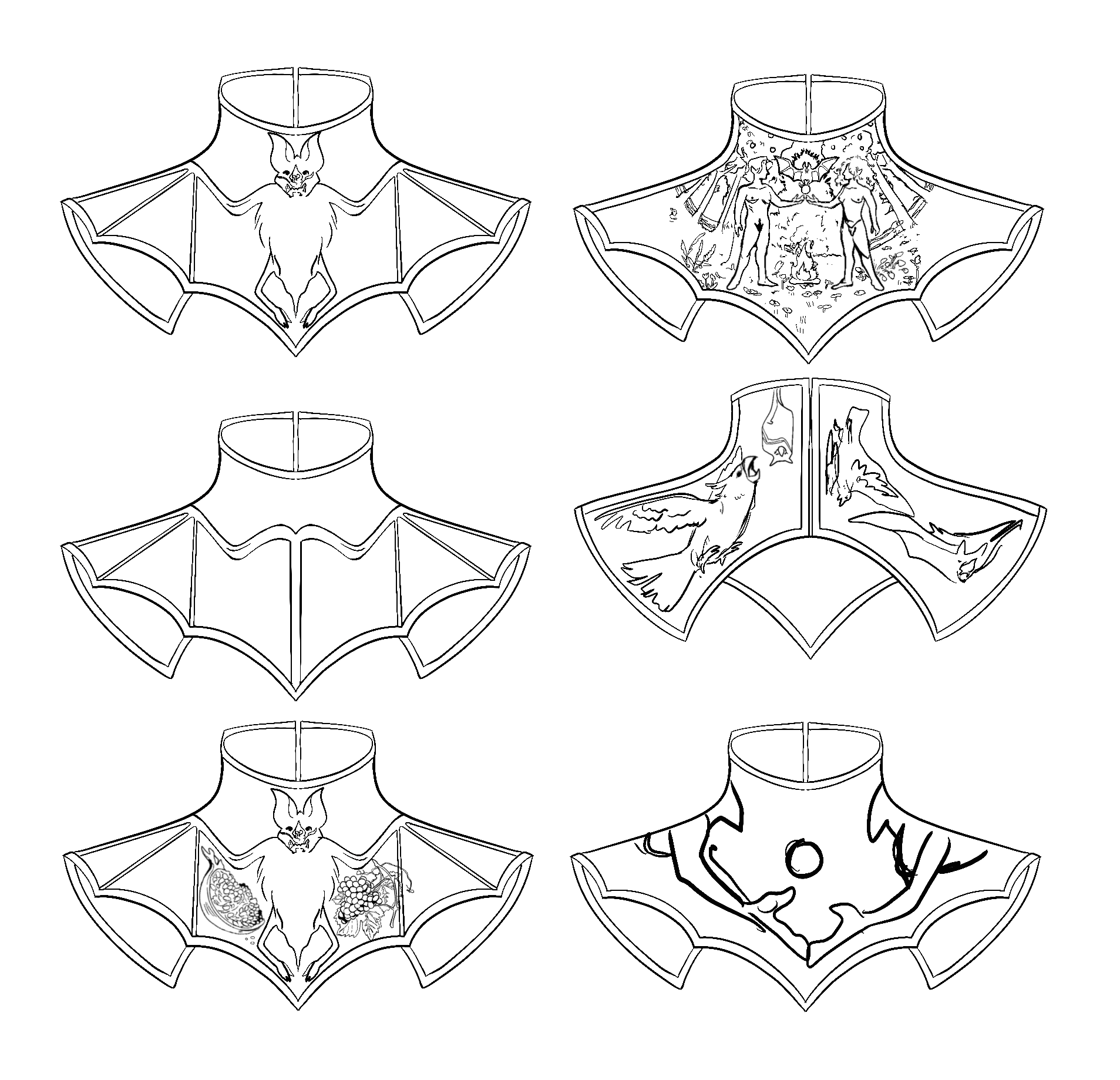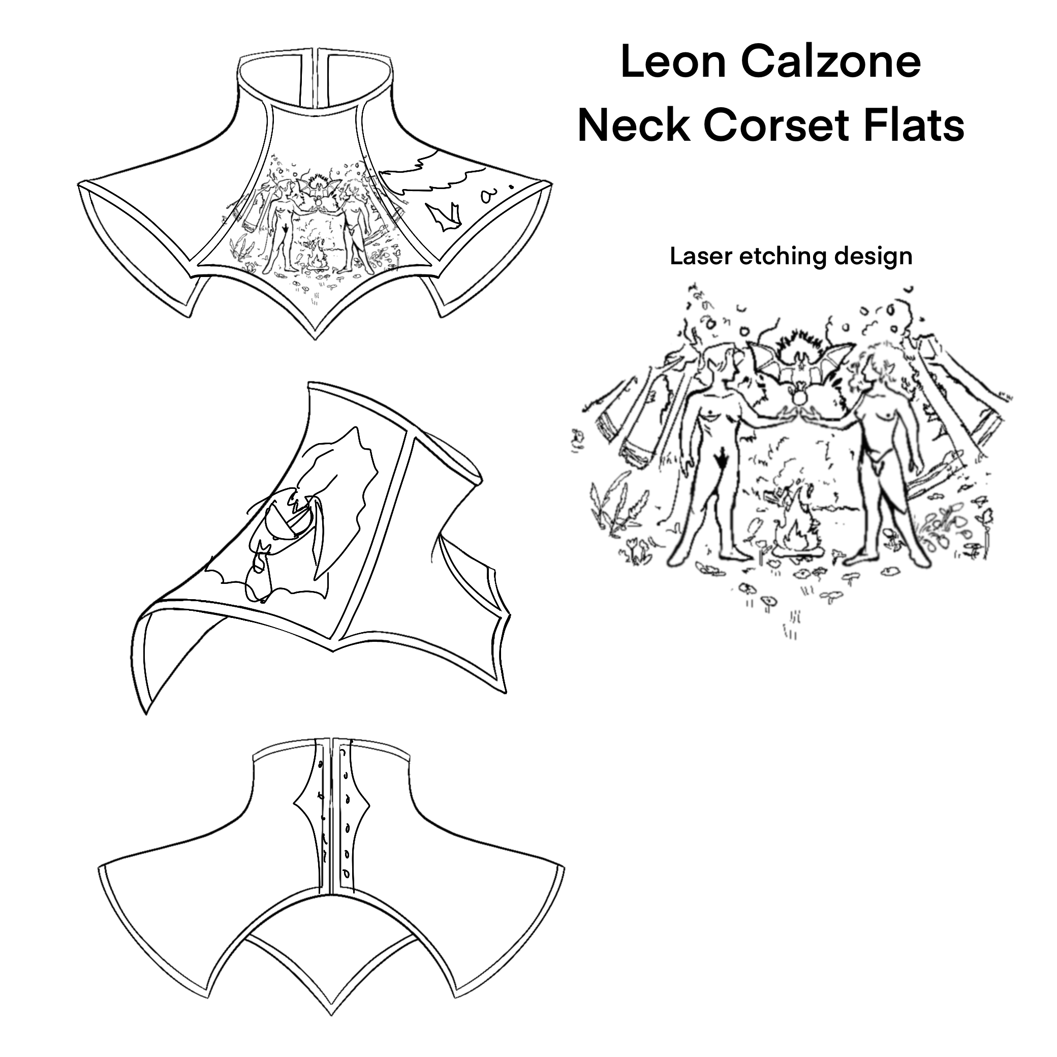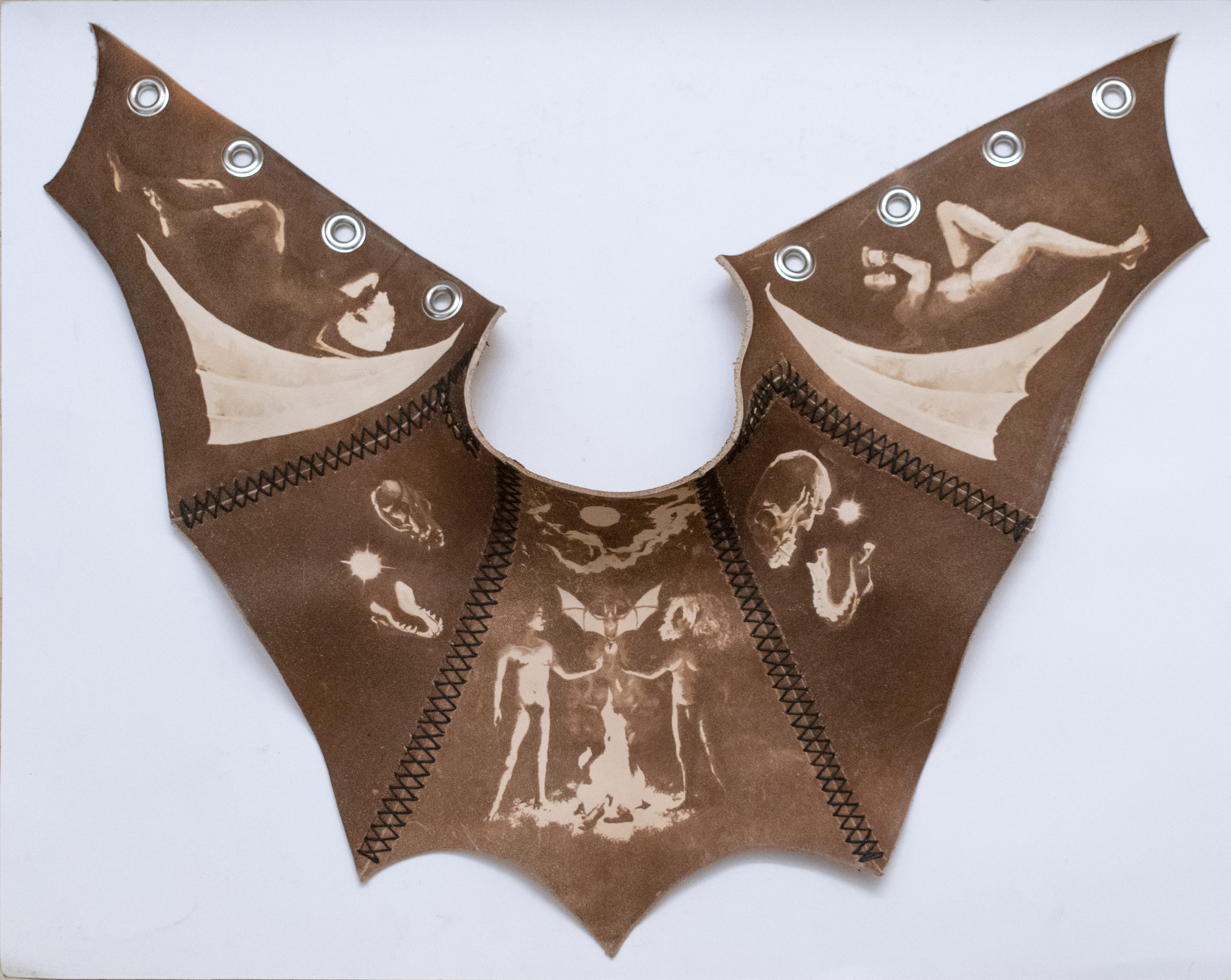 These pieces were made by laser engraving illustrations onto leather panels, giving them shape through wet molding, hand-stitching them together, burnishing the edges, and adding finishing hardware.
